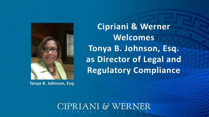 Cipriani & Werner, P.C. is pleased to announce the appointment of Tonya B. Johnson, Esq. as Director of Legal and Regulatory Compliance in the firm’s Corporate Office. Ms. Johnson is a seasoned executive with more than 15 years of leadership experience spanning financial operations, legal affairs, compliance, and strategic planning across complex, multi-entity organizations.